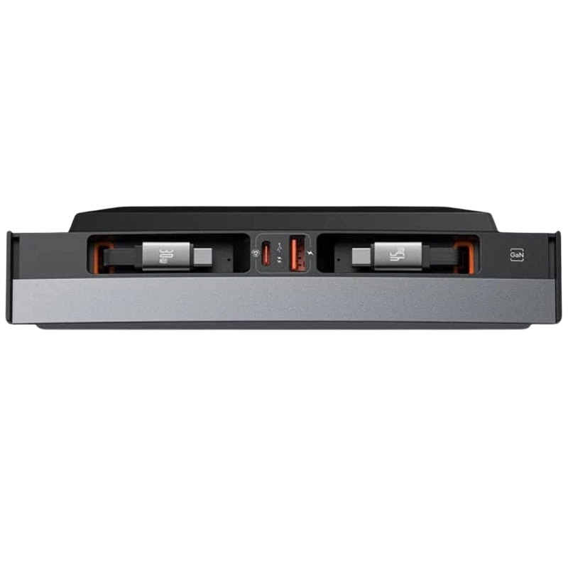 Inclui 4 portas (2x USB-C + 2x USB-A) e cabos retráteis integrados para máxima organização.